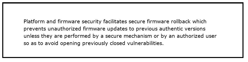 Platform and firmware security facilitates secure firmware rollback. This prevents unauthorized firmware updates to previous authentic versions. However, make sure a secure mechanism or an authorized user performs the update. If you fail to do this, the update process might open previously closed vulnerabilities.